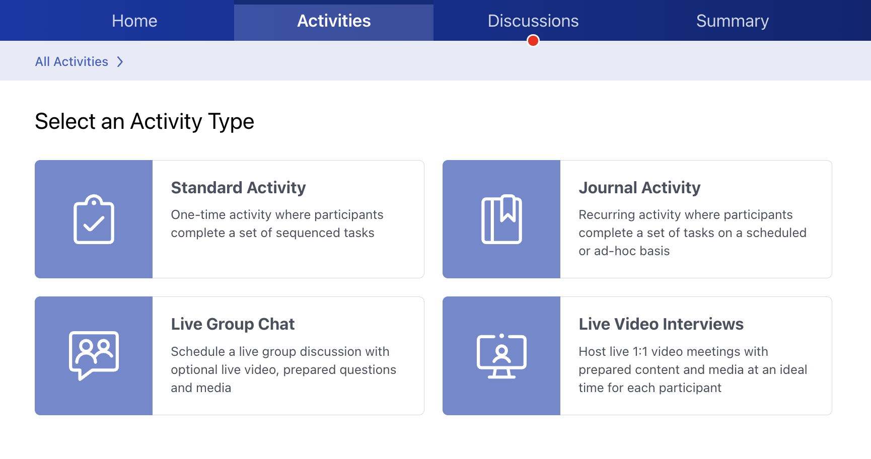 Name the Activity and press the Add button. You will then be asked if you would like a Standard, Journal, Live Group Chat (Focus Group) or Live Video Interview (IDI) Activity type.