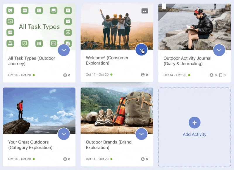 An Activity is a collection of related questions or exercises called Tasks. Think of an Activity as a mini-survey, and its Tasks are the individual questions within that survey. Activities can be completed by participants in real-time (synchronous) or over many hours and many days (asynchronous).