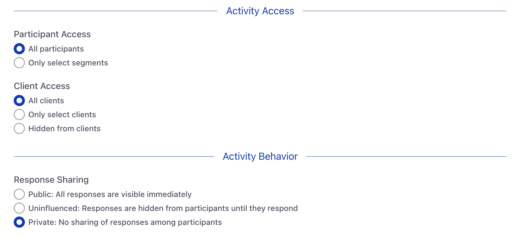Similarly, you'll also need to set the Response Sharing for the Activity. If your Activity is social, you can make it so that it is Public (i.e. All responses are visible immediately) or Uninfluenced (i.e. Responses are hidden from participants until they respond). Your Activity can also be Private (ie. No sharing of responses among participants).