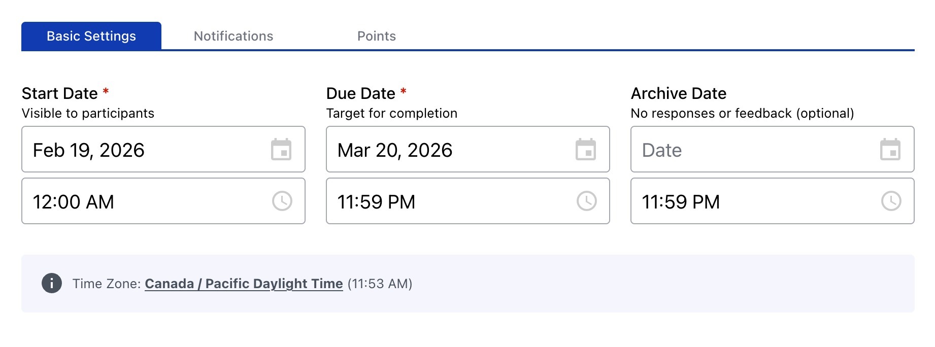 If you have participants all across North America, set the activity time zone to Pacific Time. Otherwise, participants located in central or western time zones will not see the "Add Entry" button at the correct time.
