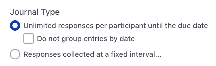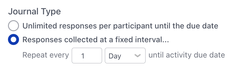 If the Activity calls for entries to be made on a specific interval (e.g. a single daily entry), then you'll want to use the Responses collected at a fixed interval... option. If selected, you'll then need to set your fixed interval (e.g. once per day, 3 times per week, etc.).