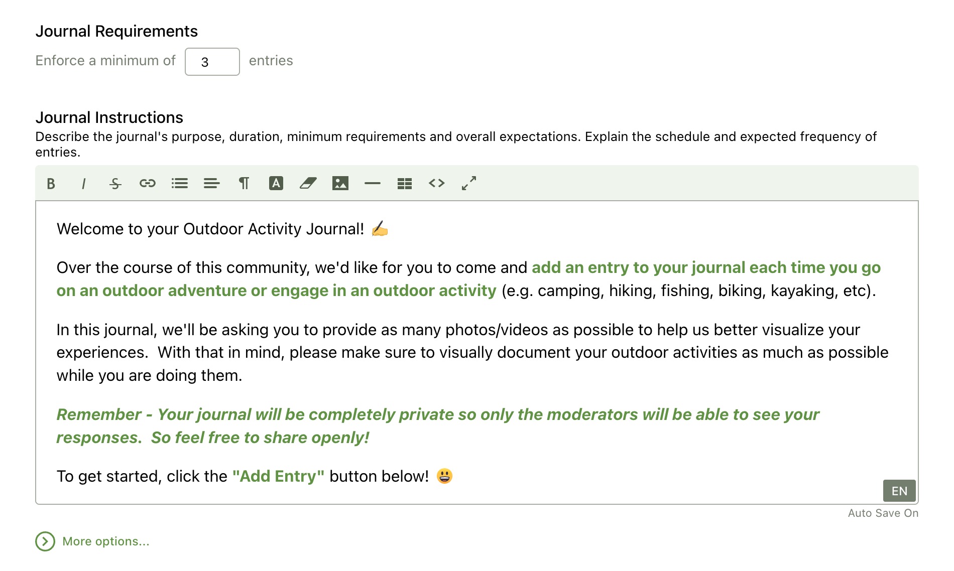 Finally, there's the Journal Instructions. This text appears above the Add Entry button when a participant clicks into the Activity. Use this space to set the stage for what the Journal Activity is all about, this way participants can get a sense of what's expected without having to start an entry.