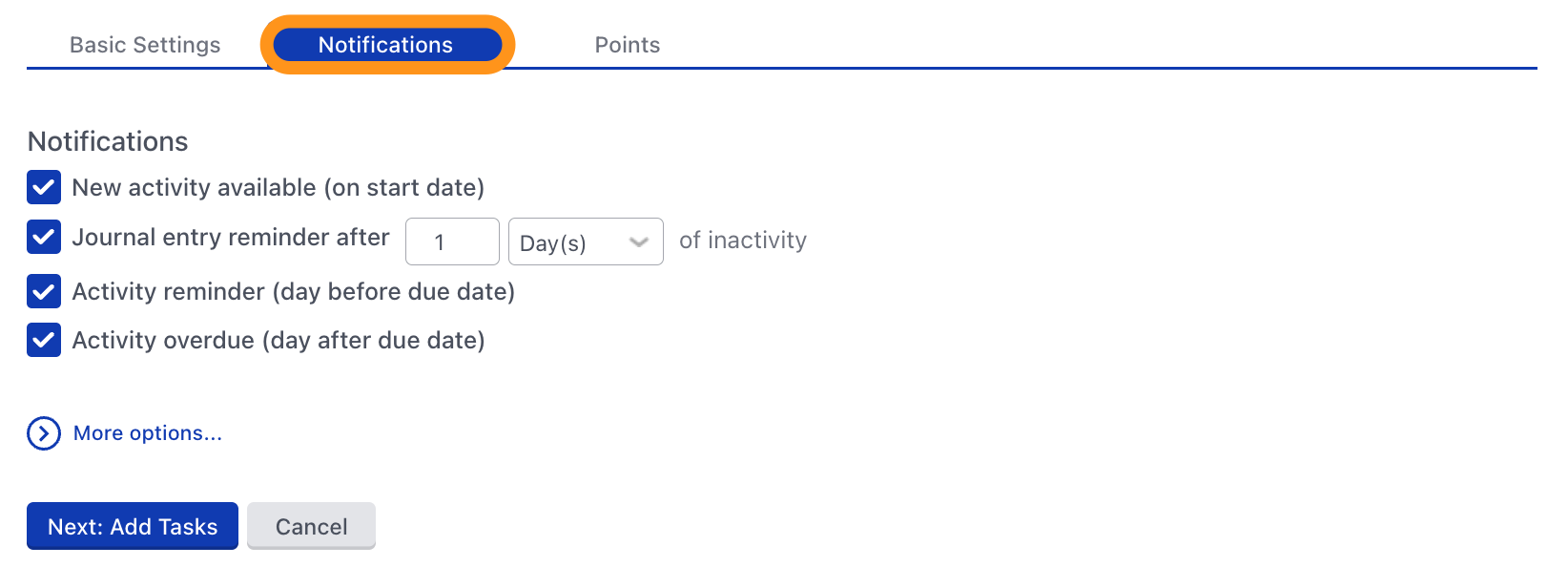 Each Activity in a Recollective Study can have customized notifications tied to it. These notification options can be found by clicking on the Notifications tab next to Basic Settings towards the top of the Activity Setup page or clicking the More options... link towards the bottom.