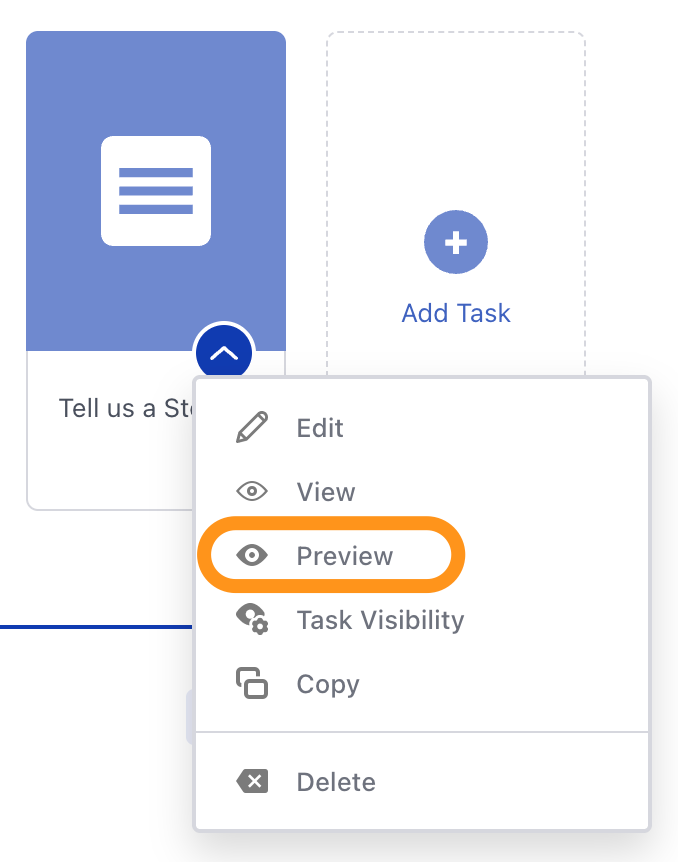 If you are working to refine the configuration of a single Task, it can be time-consuming to preview the entire Activity. To preview a single Task, use the menu control found on the Task card and select the Preview option, as shown below. You also have the option to Save & Preview when on a Task's setup page.