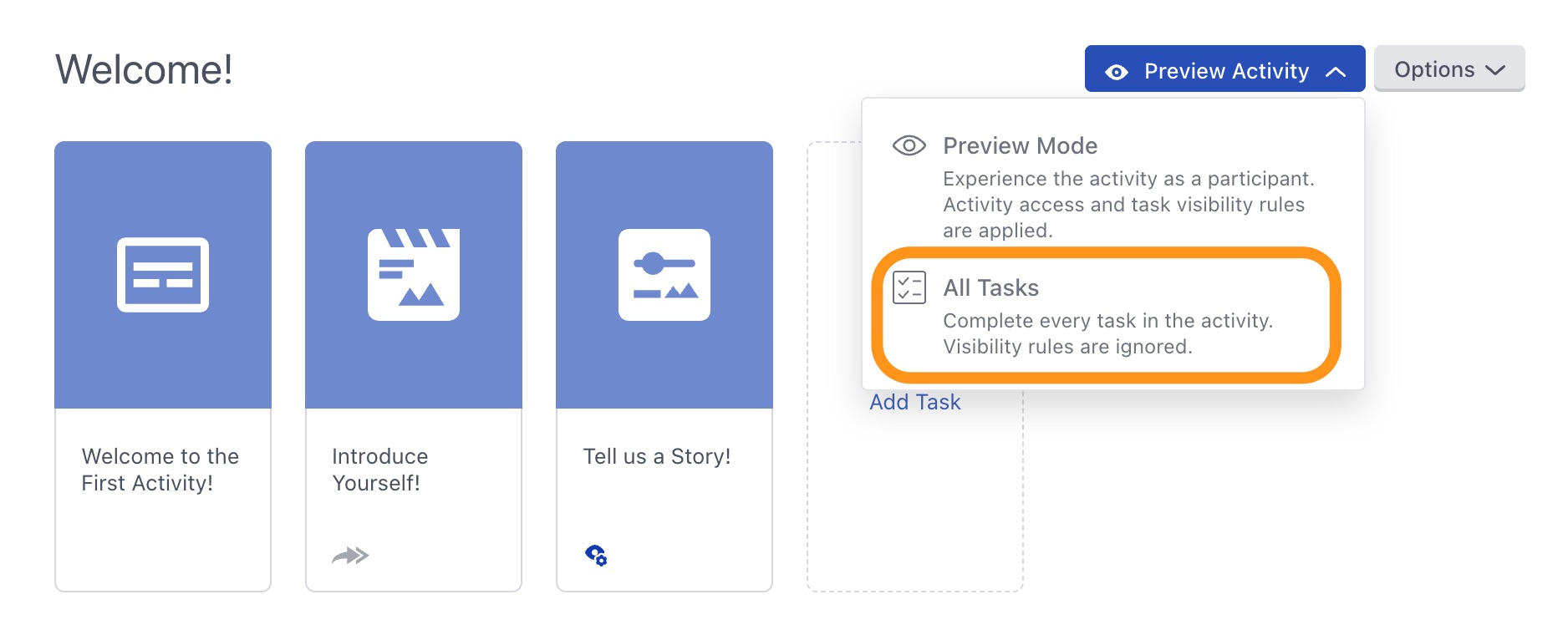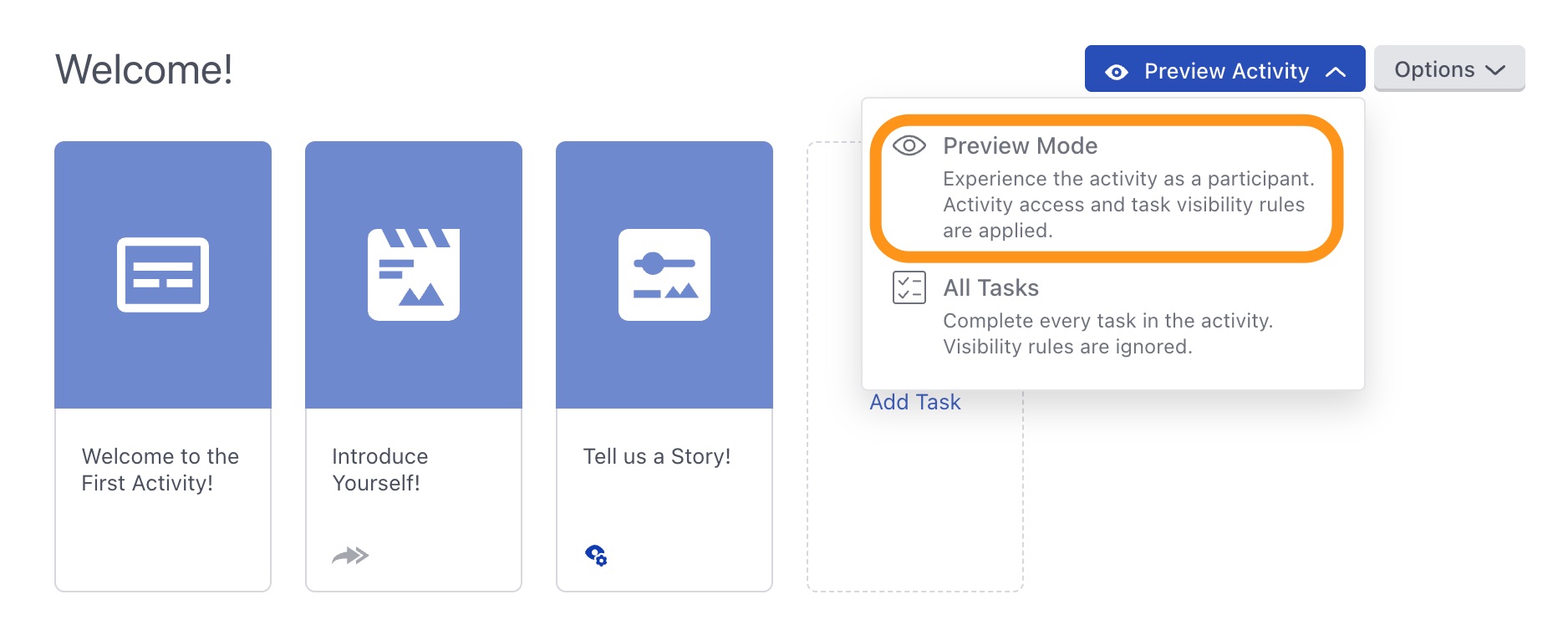 Preview Mode: Selecting the ‘Preview Mode’ option will allow you to experience the entire activity as a Participant would, with all Activity Access and Task Visibility rules applied.