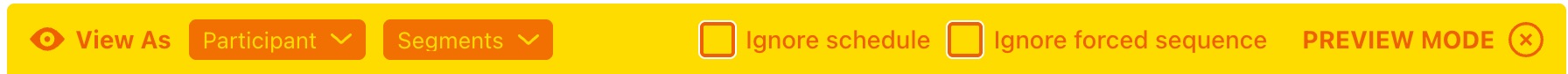- When engaging Preview Mode, a yellow bar will appear at the top of your screen. From here, you can activate Segment assignments or ignore any schedule and sequencing. This flexibility allows you to test things that might be released later on in your Study without having to complete the earlier items or reconfigure release dates. When actioned, you'll also have the option to remove any previous responses from earlier previews as well as any previous Segment assignments.