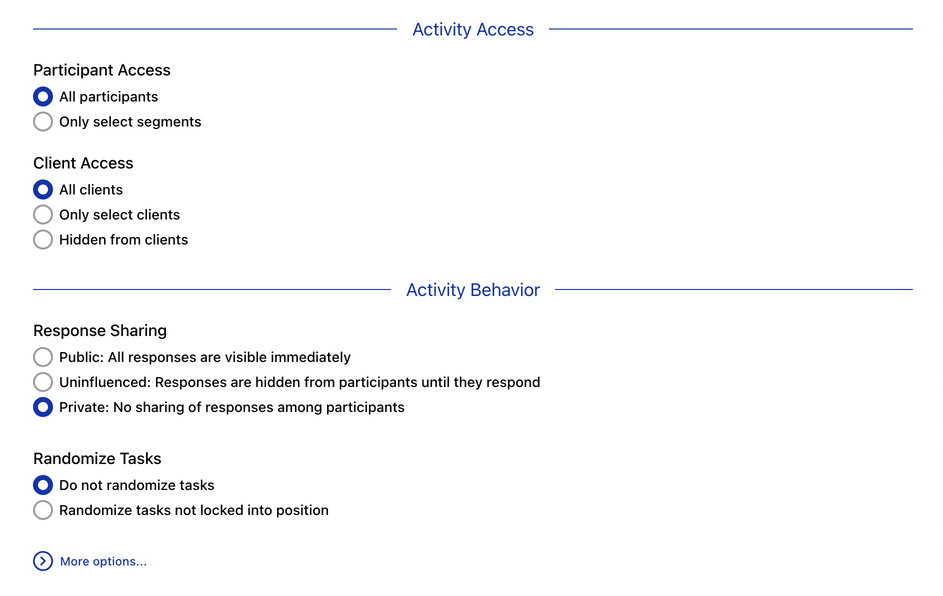 Each Activity in a Recollective study can have unique visibility and response sharing settings defined via the Activity Access and Activity Behavior options. During Activity Setup, admins can independently control which participants are permitted to see and complete the Activity, as well as who is able view the activity responses once complete. If desired, admins will also be able to control Client Access to the activity as well.