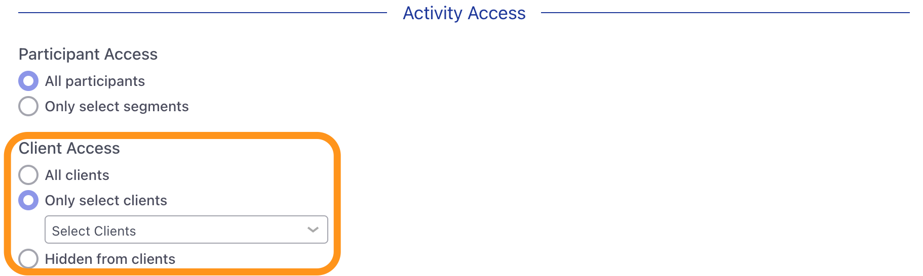 Below the Select Segments option are a series of Client Access controls. You can choose to limit the visibility of the Activity to Only select Clients, or Hide from Clients entirely if desired.