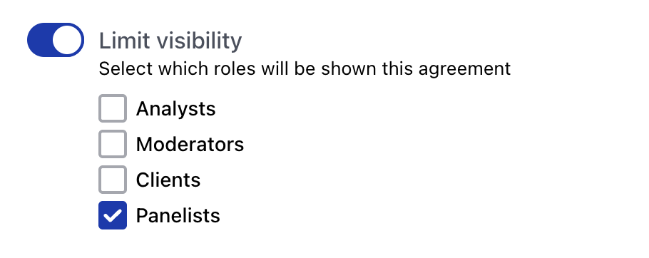 Using the Limit Visibility toggle, you can then select whether the agreement will be seen by Analysts, Moderators, Clients and/or Panelists. Most agreements you create will be for Panelists, but you could also create a Moderator agreement (if using someone external to your organization) or one for Clients so that everything is made clear up front.