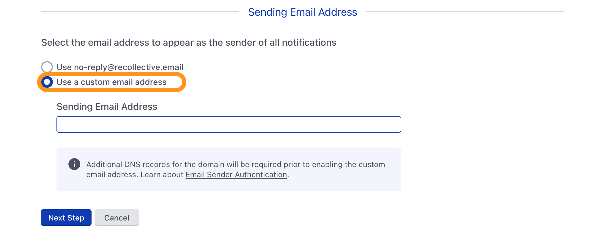 If a custom sending email address is configured, all outgoing emails will appear as if they come directly from that address. Sending email on behalf of another domain requires that Recollective be granted permission to send email with that domain. Without such permission, there is a risk that its messages will be mistaken for junk mail.
