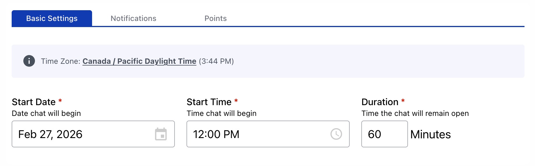 With the Live Group Chat Activity type, the date setup is more straightforward. Simply select a Start Date, Start Time and intended Duration. The time zone for the Activity is displayed directly above these fields as well.