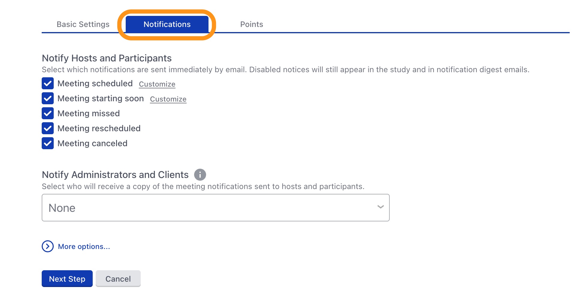 - Meeting Scheduled: Participants will receive a confirmation email when a meeting has been scheduled for them. The content of this message can be customized by selecting 'Customize'. Admins will also receive a notification confirming that a meeting has been scheduled.