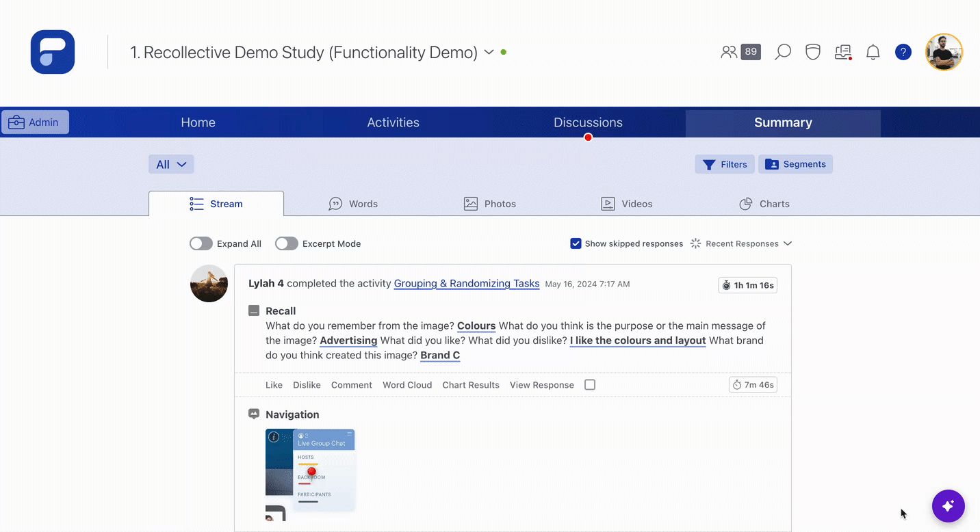 As you moderate within your study, Analysts and Moderators will see a purple icon positioned in the bottom right-hand corner of the page. Once participant responses have been received, Admins can open the window to set the context of their question.