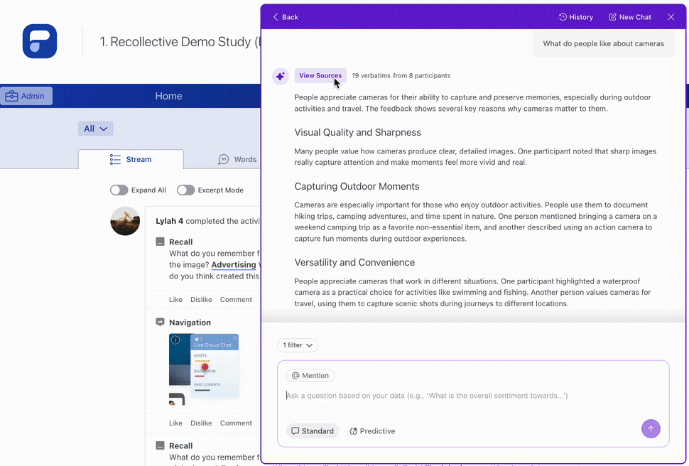 - Standard Mode: Ask open-ended questions within your study data and receive summarized, data-backed insights with supporting verbatims.