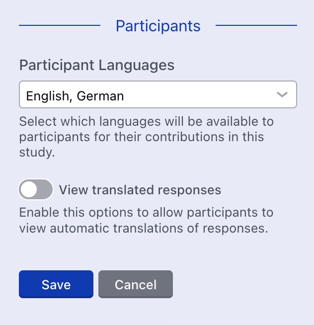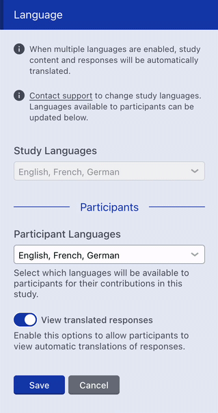When more than one Participant Language is defined, automatic translation of responses, discussions, comments and replies will be available to participants by default. However, Admins can disable access to this feature from the Language menu by toggling View translated responses beneath the Participants sub-header.