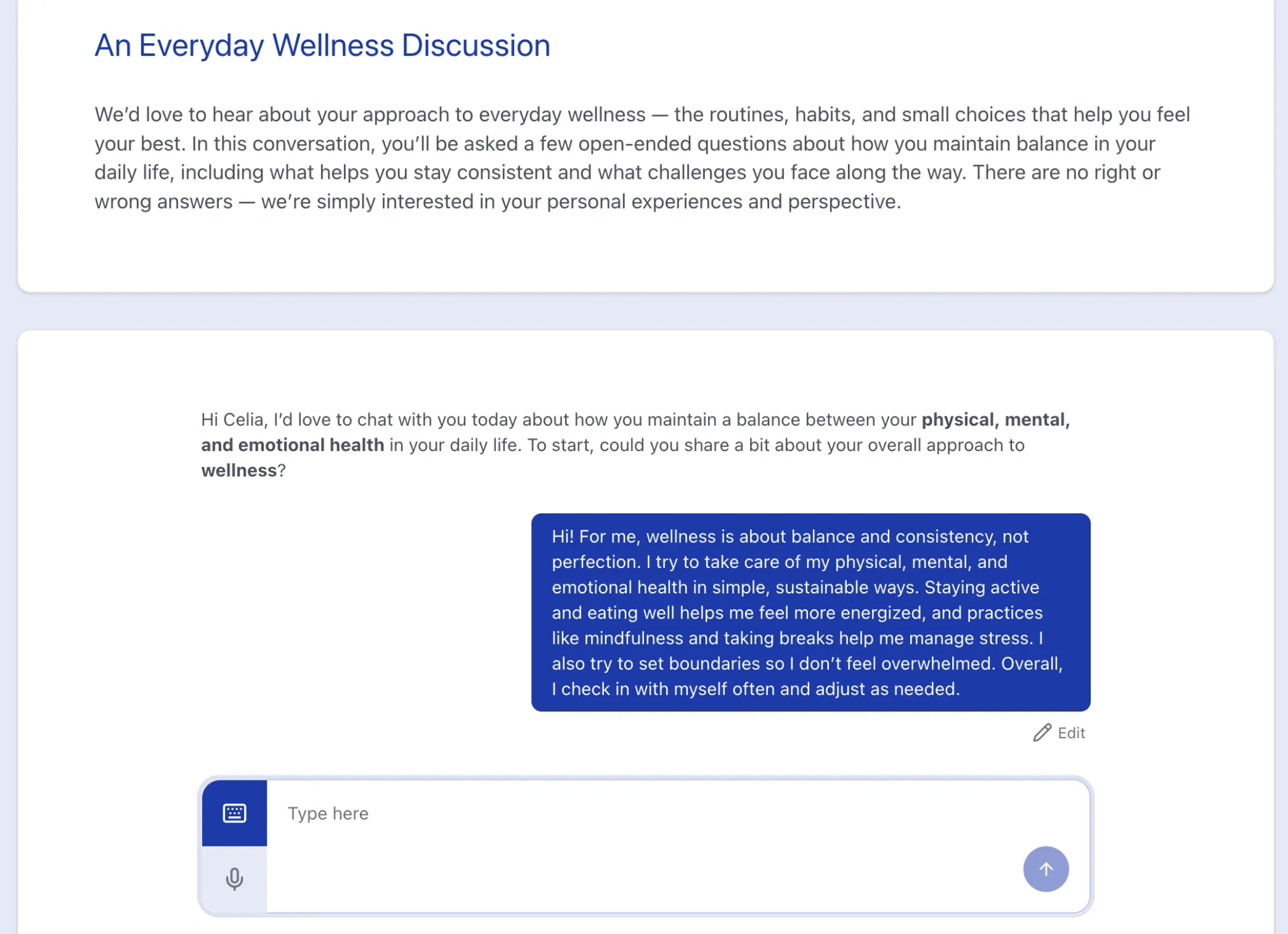The AI begins by introducing the topic and then adapts its follow-up questions in real time based on participant responses. Conversations are automatically saved as they progress, allowing participants to exit and resume at any time. If needed, participants can Edit their most recent message before continuing the conversation, and the AI moderator’s subsequent reply will update automatically to reflect the change. Once the objective is reached and the conversation is fully completed, it cannot be restarted unless an administrator has rejected the task response.