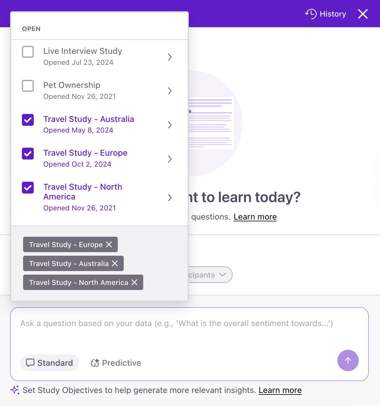 MultiProject comparisons will be made at the study-level. Ask AI cannot answer questions based on specific metadata such as task setup, participant profile data, and dates.