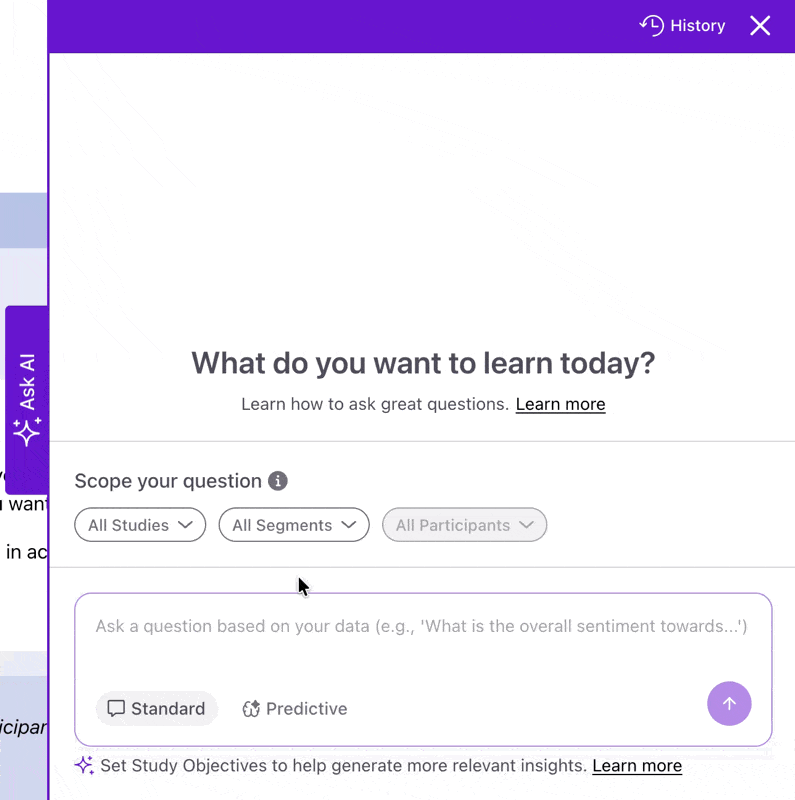 - Be Specific: As Participant filters and @mentions will be disabled, use the Study and Segment Filters whenever applicable to improve response accuracy.