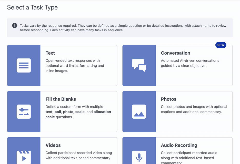 Task configurations can range from a single question to detailed instructions, or clear and defined objectives which can be used to guide powerful AI-driven conversations. Participants can be asked to download a file, view a photo or play a video before responding.